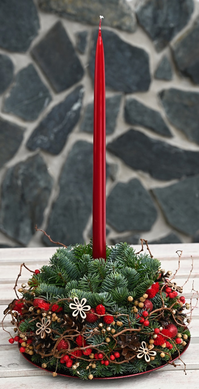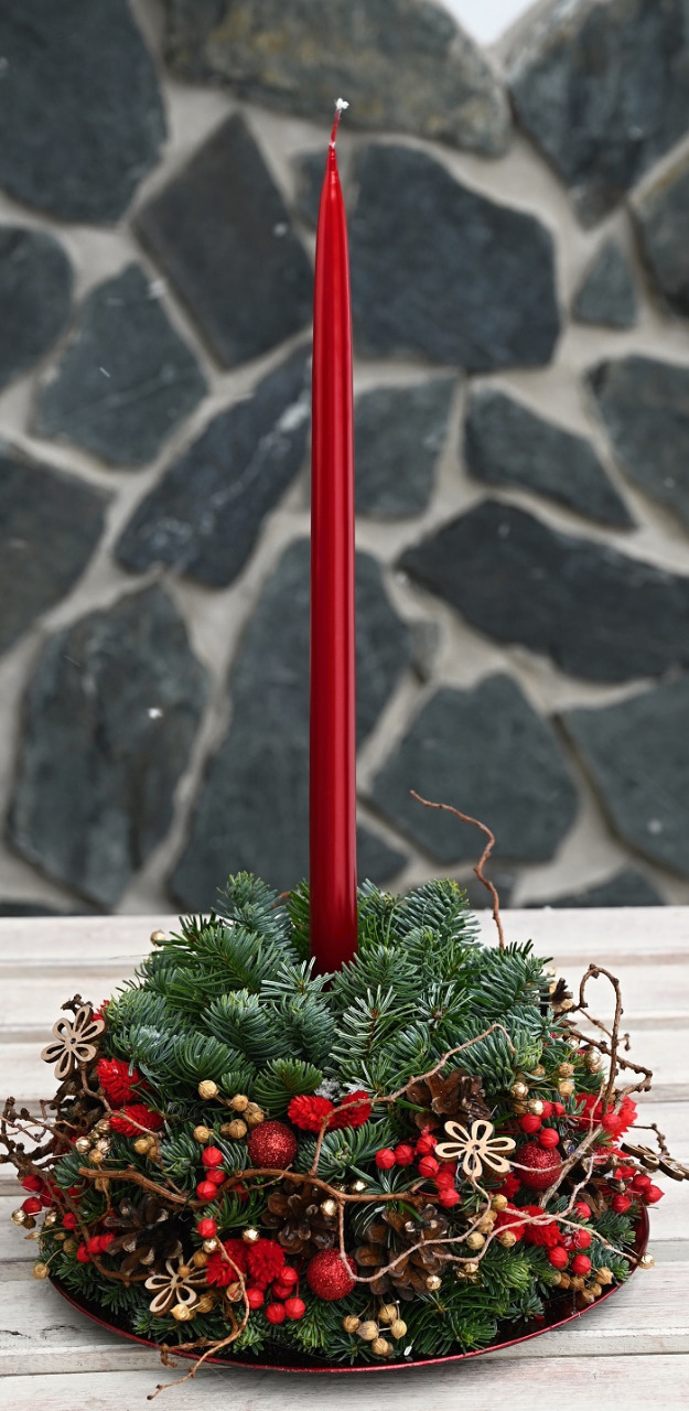 Vianočný svietnik s červenou sviečkou, živou čečinou, zdobený prírodným materiálom a vianočnými ozdobami.