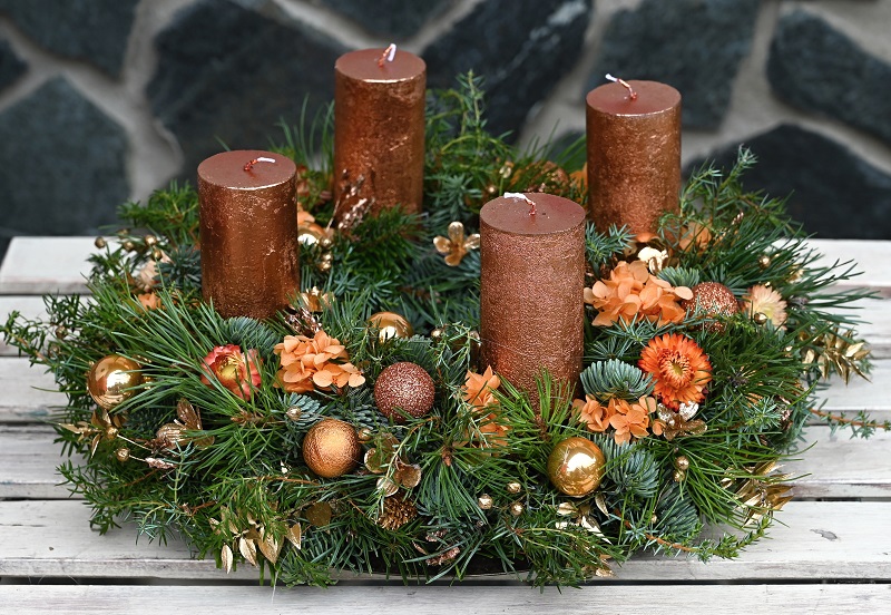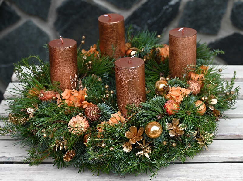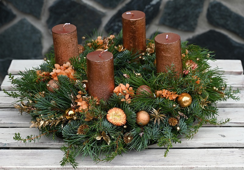 Adventný veniec zo živej čečiny s medenými sviečkami, zdobený stabilizovanou hortenziou, slamienkami a vianočnými ozdobami.